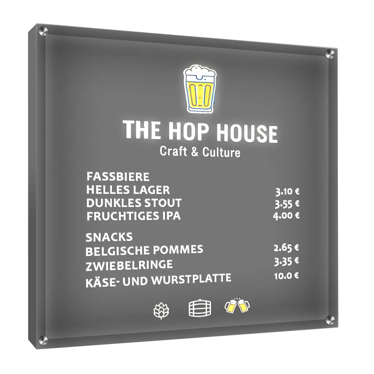 Jedes Plexiglas Leuchtschild wird individuell nach Kundenspezifikation gefertigt. Wählen Sie Größe, Form, Materialstärke, Art der Oberfläche (matt oder glänzend) sowie das gewünschte Motiv – sei es ein Firmenlogo, Schriftzug oder grafisches Design.