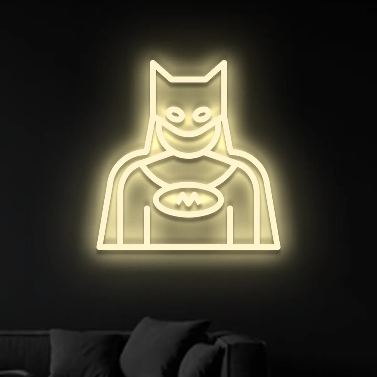 Die legendäre Silhouette von Batman im Stil klassischer Comics: charakteristische Maske, Umhang und das gelbe Oval mit dem Fledermaus-Symbol auf der Brust. Dieses zeitlose Motiv leuchtet nun mit weichem, premium LED-Neon und verleiht jedem Raum die Atmosphäre eines echten Superhelden – stilvoll, leicht nostalgisch und von jedem sofort erkennbar.