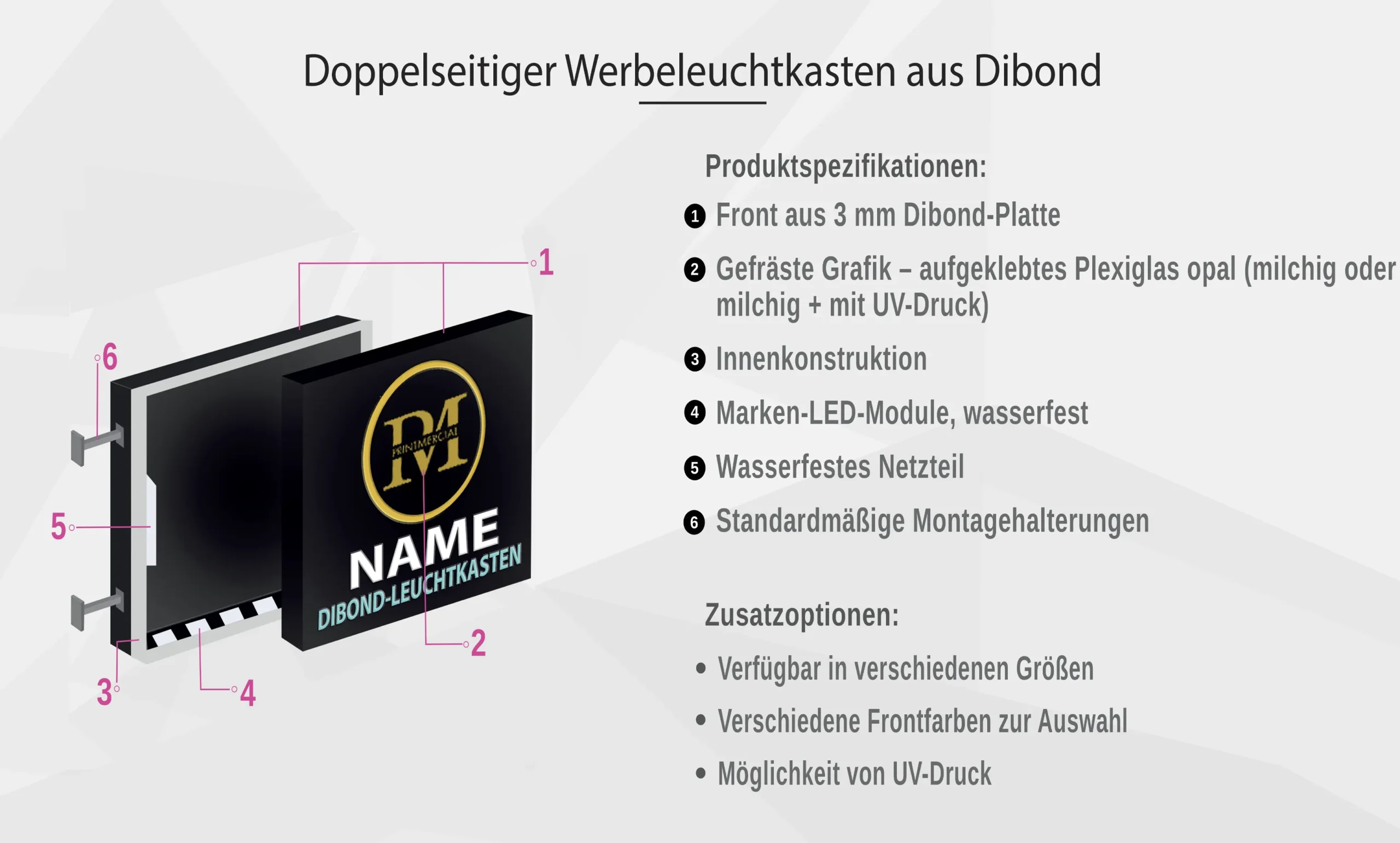 Ein Dibond-Leuchtkasten beidseitig von PrintMercial ist eine Investition, die Ihre Marke rund um die Uhr sichtbar macht und nachhaltig beeindruckt.
